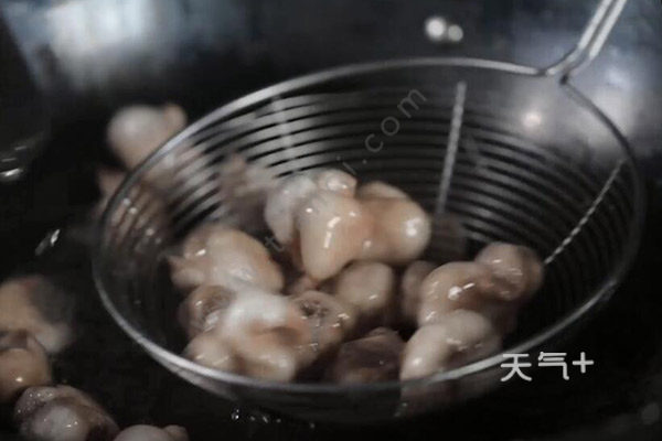 6、锅中倒入小半锅油,油温6成热,加入沥干的肥肠油爆4分钟后捞出沥油;