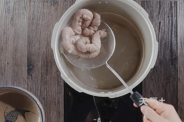 5、肥肠洗净后,放入高压锅、加3勺料酒、大葱,上汽后中火煮10分钟捞出,冷却后切好;