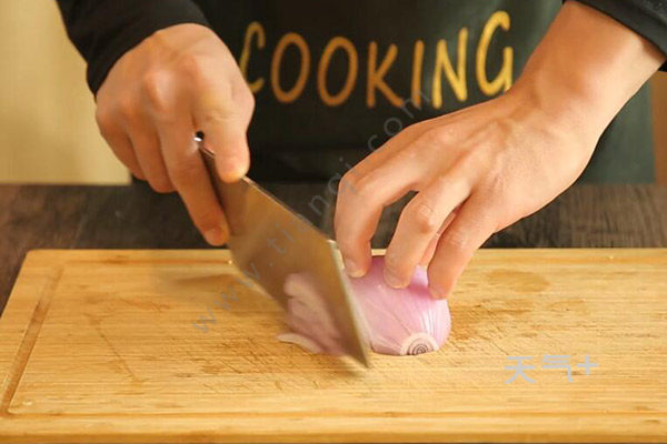 4、热锅冷油,放入姜、蒜片、洋葱丝炒匀;