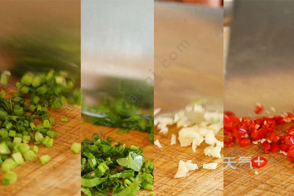 2、小葱切葱花,香菜切碎,蒜切末,小米椒切末;