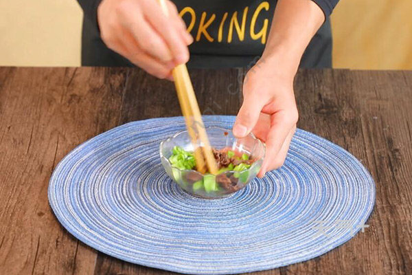 7、青椒切碎,加入一勺酱汁拌匀;