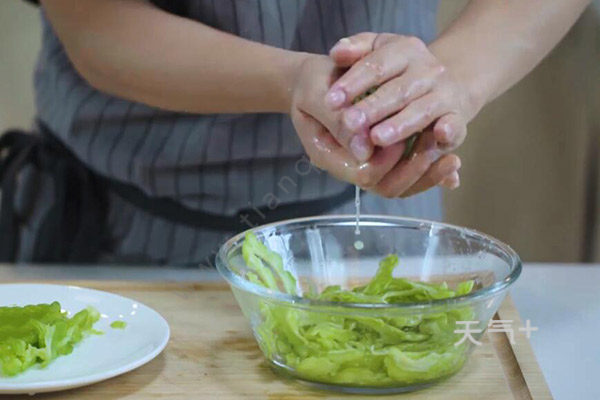 4、腌制好的苦瓜挤出水分,备用;