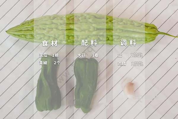 苦瓜1根、青椒2个、大蒜1瓣、盐2茶匙、鸡精1茶匙