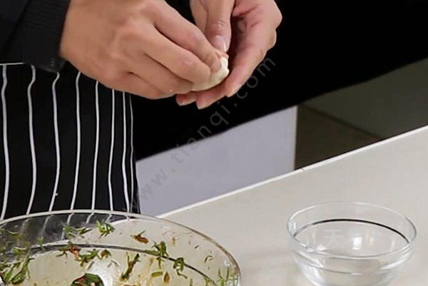 5、饺子皮里包入拌好的茴香馅;
