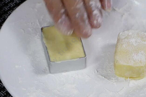 3、取适量面团放在掌心上,裹入适量的豆沙馅,揉成丸子状,整成方形;