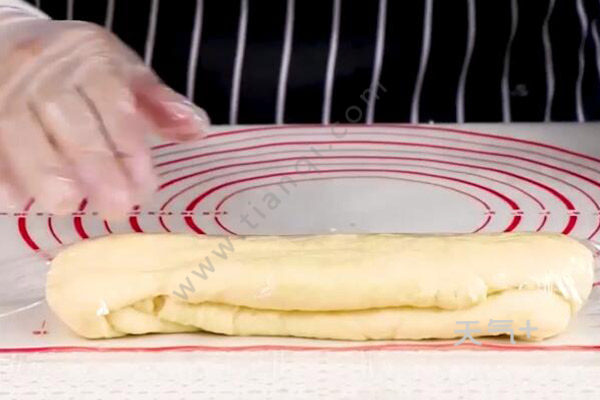 3、将面团压扁,从中间对折,然后把两端对折,再把压扁的面团盖上保鲜膜,冷藏4个小时;