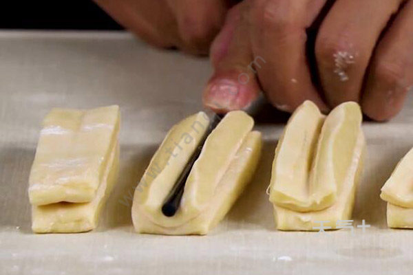 4、取出面团,压扁,擀成形成1cm厚度的面饼,再切成宽约3cm左右的面块;