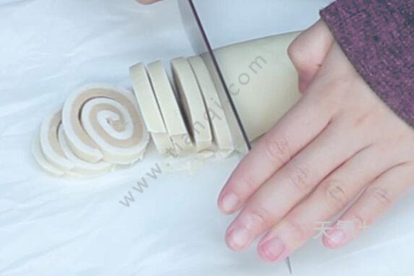 5、白糖面团和红糖面团擀开擀薄,红面团放在白面团上面,卷起,放入冰箱冷冻1小时;