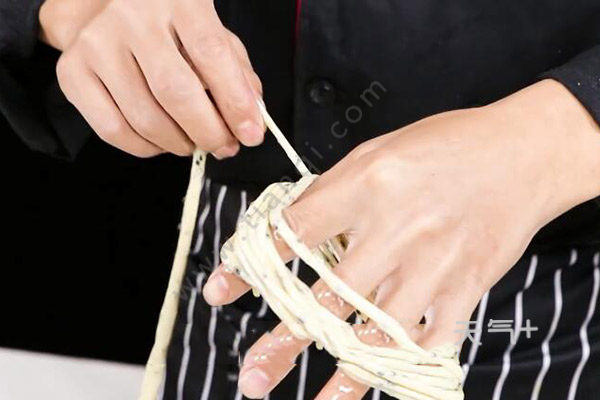 3、醒发好后先放在手指上盘条,再用两根筷子撑起来,拉长一下放入锅里炸;