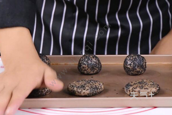 3、拿出静置好的面团,分成小面团,搓圆,裹上黑芝麻,压扁;