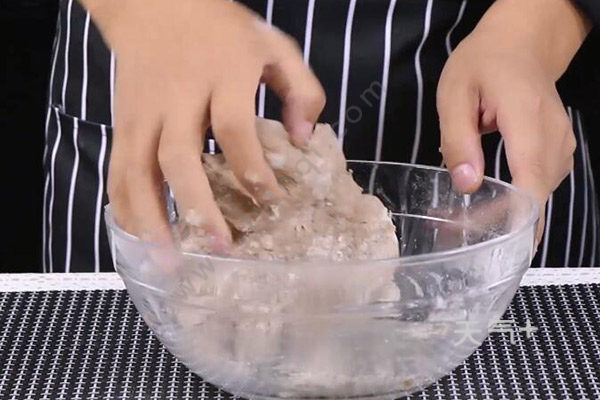 1、把全麦粉、中筋面粉、黄油、糖粉和小苏打倒入一个碗中,混合均匀,揉成面团;
