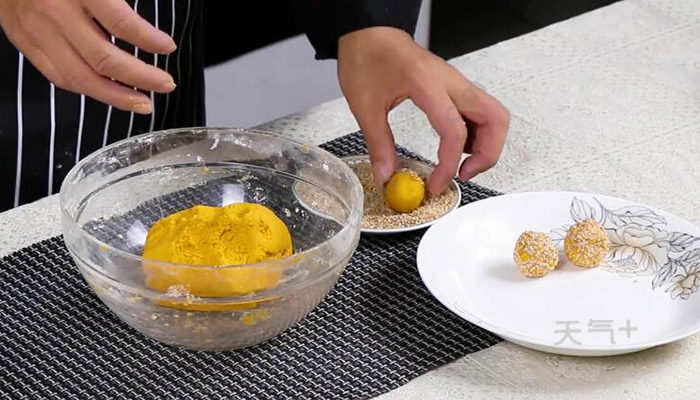 2、南瓜泥中加入糯米粉,做成面团,再分成大小相同的糯米球,滚上白芝麻;