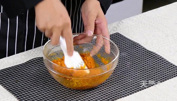 1、南瓜去皮切片,蒸熟取出,加入白糖适量,搅拌成南瓜泥,放凉;