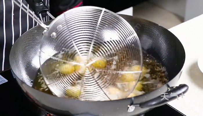 3、锅中倒油,油烧热之后,放入糯米圆子开始炸;