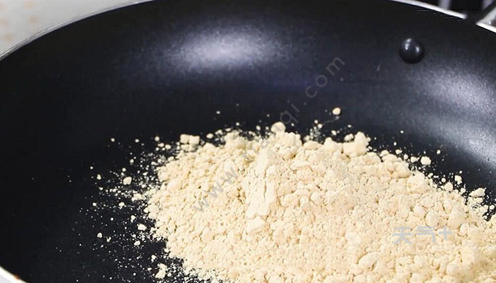1、黄豆粉放入锅中,加热翻炒,炒至颜色变深,装入碗中;