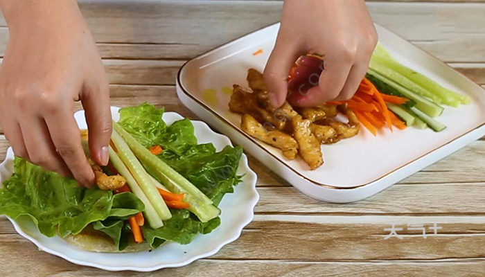 鸡胸肉切成长条,调入盐、黑胡椒粉、料酒、生抽、姜片、淀粉拌匀,腌制30分。胡萝卜切条,黄瓜切条。锅内倒入适量油,放入鸡胸肉炸至金黄,捞出。面饼放入锅中,小火烙熟,盛出放入盘中,放上生菜、黄瓜条、鸡肉。最后淋上番茄酱,卷起即可。