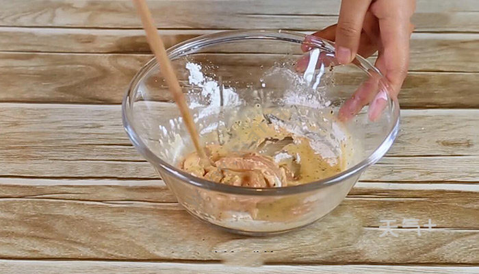 1、鸡胸肉切成长条,调入盐、黑胡椒粉、料酒、生抽、姜片、淀粉拌匀,腌制30分钟;