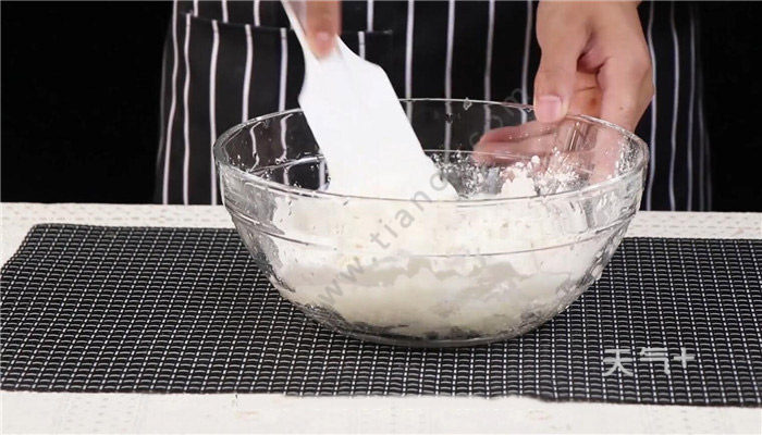 3、面粉倒入碗中,加入温开水,制成光滑的面团;