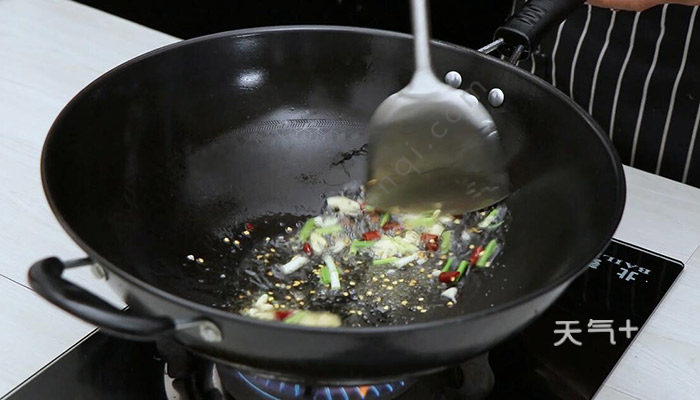 2、锅里倒适量油,油热后下入干辣椒、蒜、白糖、葱花,大火爆香;
