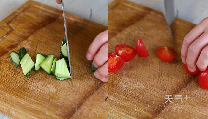 2、黄瓜洗净切块,圣女果洗净对半切开;
