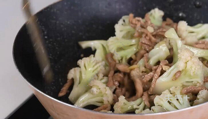 5、锅里倒适量油,油温烧至6成热,爆香姜蒜末,再倒入肉丝翻炒至变色,放入花菜翻炒均匀;