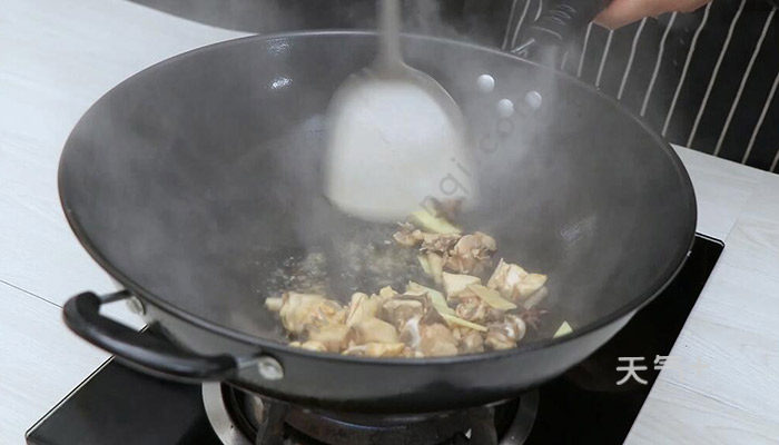 4、起锅倒油,油热倒入鸡块翻炒,再倒入料酒、生抽、八角、姜片翻炒均匀;