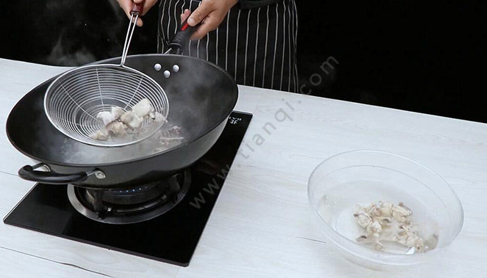 3、锅里倒入适量清水,鸡肉块凉水下锅,焯水捞出,控干水分;
