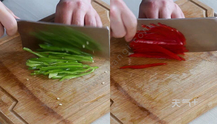 2、青椒洗净去籽切丝,红椒洗净切丝;