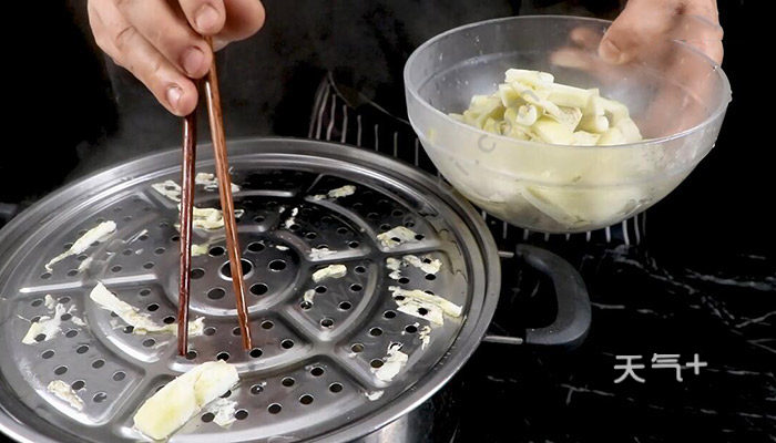 2、将茄子放入蒸锅,蒸10分钟左右,捞出晾凉;