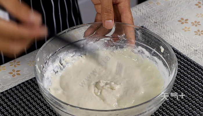 2、面粉中倒入酵母水,搅拌至粘稠面糊状;