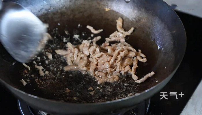 4、锅中加入适量油,油温烧至7成热,放入肉丝炒至变色,捞出;