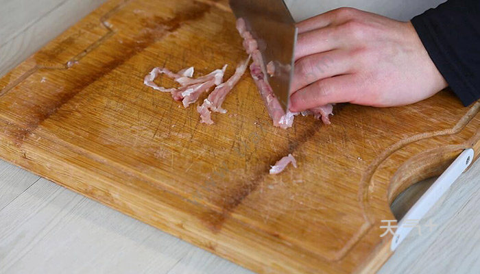 1、里脊肉切片,再改刀切丝;