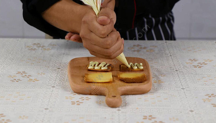 6、巧克力隔水加热融化装入裱花袋,挤在饼干背面;