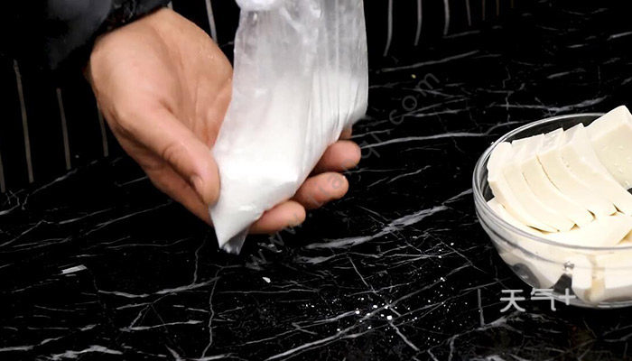 3、密封袋内加入土豆淀粉,放入豆腐,裹上淀粉;