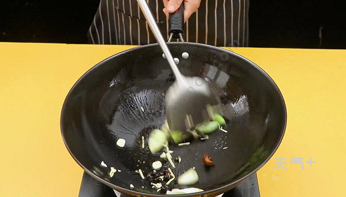 3、锅内倒油烧热,放入八角、葱段、姜、蒜、豆豉煸出香味;