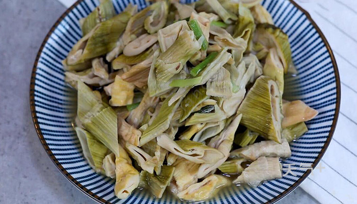 4、把笋干倒入锅中,翻炒几下,葱油笋干的家常做法 笋干怎么做好吃再加适量盐和生抽炒匀,倒入适量清水,加盖煮沸;