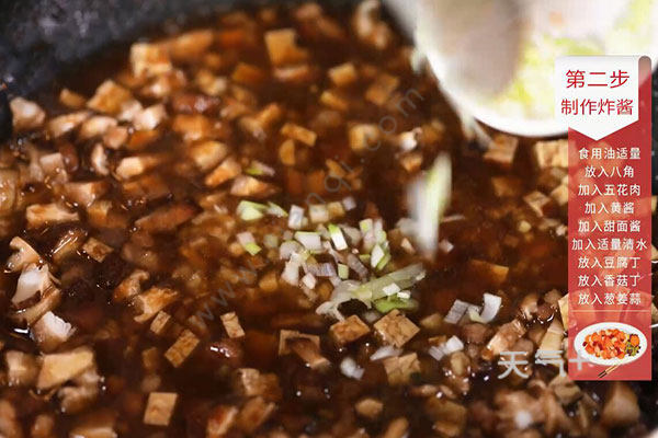 3.锅中倒入适量油,油温烧至7成热,放入八角炒香,加入五花肉煸炒出油,加入黄酱、甜面酱、清水适量拌匀,小火炸10分钟,放入豆腐丁、香菇丁、葱姜蒜、香油半勺、白糖20克继续炸10分钟;