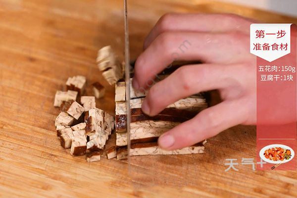 去皮五花肉150克,面条300克,豆腐干1块,黄瓜50克,黄豆20克,黄豆芽50克,胡萝卜50克,香菇2朵;