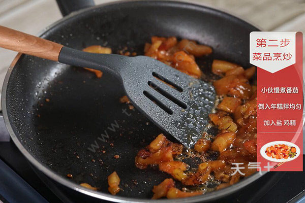 2.锅中倒入番茄,小火慢熬,将番茄压成无颗粒状。