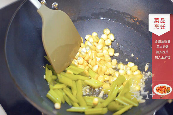 3.锅中留底油,放入蒜片爆香,放入西芹、玉米粒、百合翻炒至断生,加入腰果翻炒均匀,放入盐半勺,翻炒均匀即可出锅。