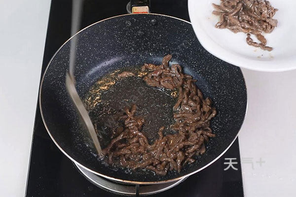 3.油温烧至7成热,放入牛肉丝炒至变色,盛出待用;