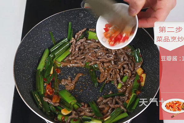 4.锅中留底油,放入姜蒜片、豆瓣酱1勺炒香,放入蒜苗炒至断生,放入牛肉丝、小米椒炒匀;