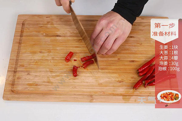 1.姜切片,大葱切段,蒜切片,泡姜切片,泡椒切开;