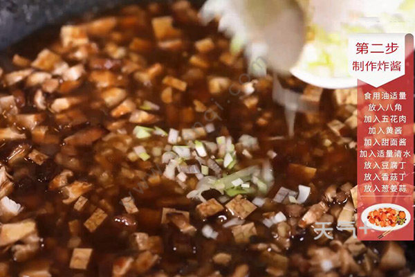 五花肉、豆腐干、香菇洗净切成小丁,锅中倒入适量油,油温烧至7成热,放八角炒香,五花肉丁炒出油,加黄酱、甜面酱和清水拌匀,小火炸10分钟,放入豆腐丁、香菇丁、葱姜蒜、继续炸10分钟。
