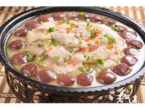 具有独特风味的白肉血肠,驰誉吉林食苑已有长久历史。这道菜的风味特点是:白肉薄如纸帛,色白有光,味美异香,吃起来肥而不腻,瘦而不柴,松软鲜嫩,血肠脆嫩绵软,热汤鲜香味醇,佐料五味俱全,冬用不冷,夏用不热,脍炙人口。血肠有清有混,是由沙仁、桂皮、紫蔻等10多种配料灌制而成。食用时用韭菜花酱、辣椒油、姜汁腐乳、蒜末、虾油、香油等为佐料,别具风味,备受欢迎。