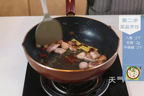 2.锅中放入适量油,油温烧至6成热,放入五花肉煸炒至微焦,放入姜片、八角、干辣椒、花椒炒香;