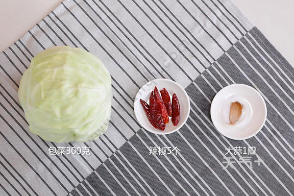 1.包菜洗净撕成小块待用,大蒜1瓣切末,干辣椒5个切段备用。