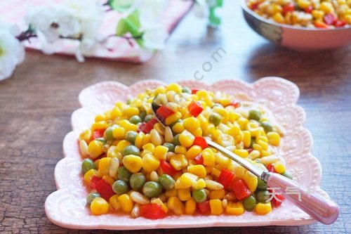 1、红菜椒去籽洗干净,切成菱形片,玉米棒去皮和须,削下玉米粒;