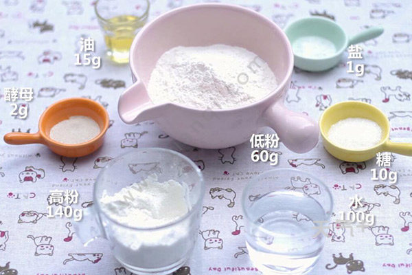 低粉60克、酵母2克、高粉140克、水100克、糖10克、盐1克、油15克