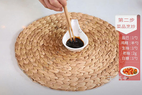 2.碗中放入:盐1勺、鸡精半勺、生抽1勺、老抽2克、白糖1勺拌匀调成酱汁;